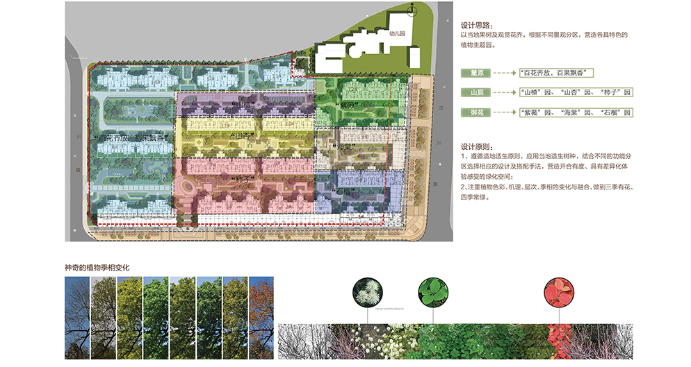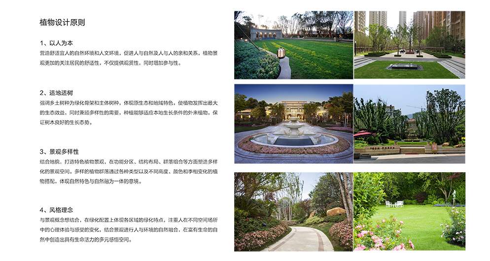Follow the general landscape style and showcase the site's landscape features; use local plants as predominant species; consider both short-term and long-term landscape effects; control the budget; focus on aesthetics and ecological effects of plants; take advantages of plants’ characteristic forms, colors, textures and aesthetics after combinations to present diversified vegetation spaces and seasonal changes.